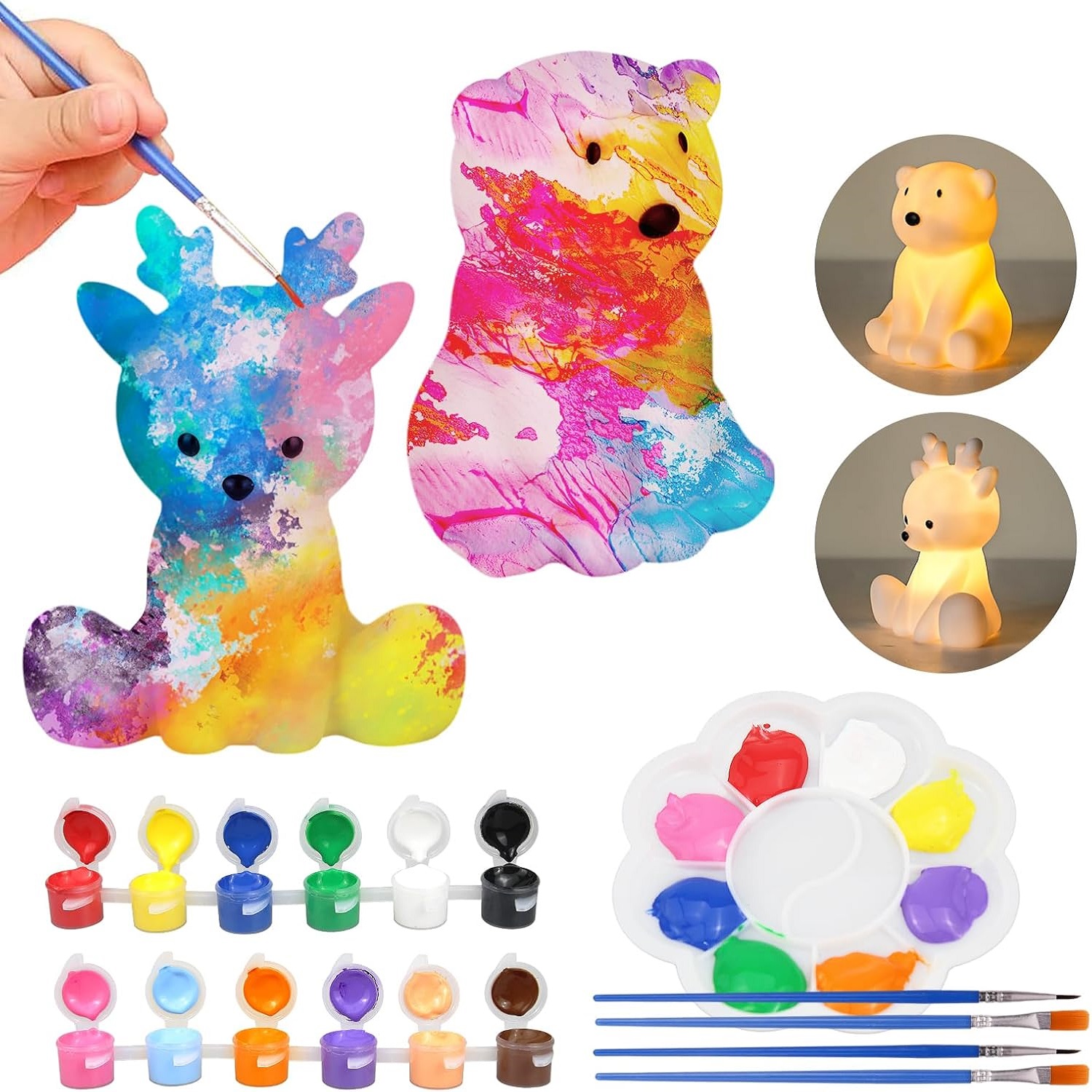 💡【Design Your Own Night Light】: This DIY bear and deer night light is a fun arts and crafts for kids ages 4-12. It allows kids to enjoy the pleasure of DIY painting and cultivate their hands-on and collaborative skills. This art kit includes all the components you need to create your DIY night light, including a deer night light, a bear night light, twelve colors of paint, a palette, and four paintbrushes. Your child will be immersed in the painting process. Are you ready to have fun?